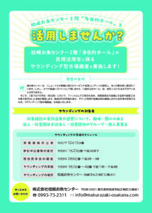 2階多目的スペースの活用に向けて、テナント(小売・飲食・製造所・事務所など)の利用も含め、民間事業者との協業を最大限活かした提案を募集します。施設の利活用策のほか、テナント利用や協業体制の構築に向けた条件等を把握するため「サウンディング型市場調査」を実施いたします。