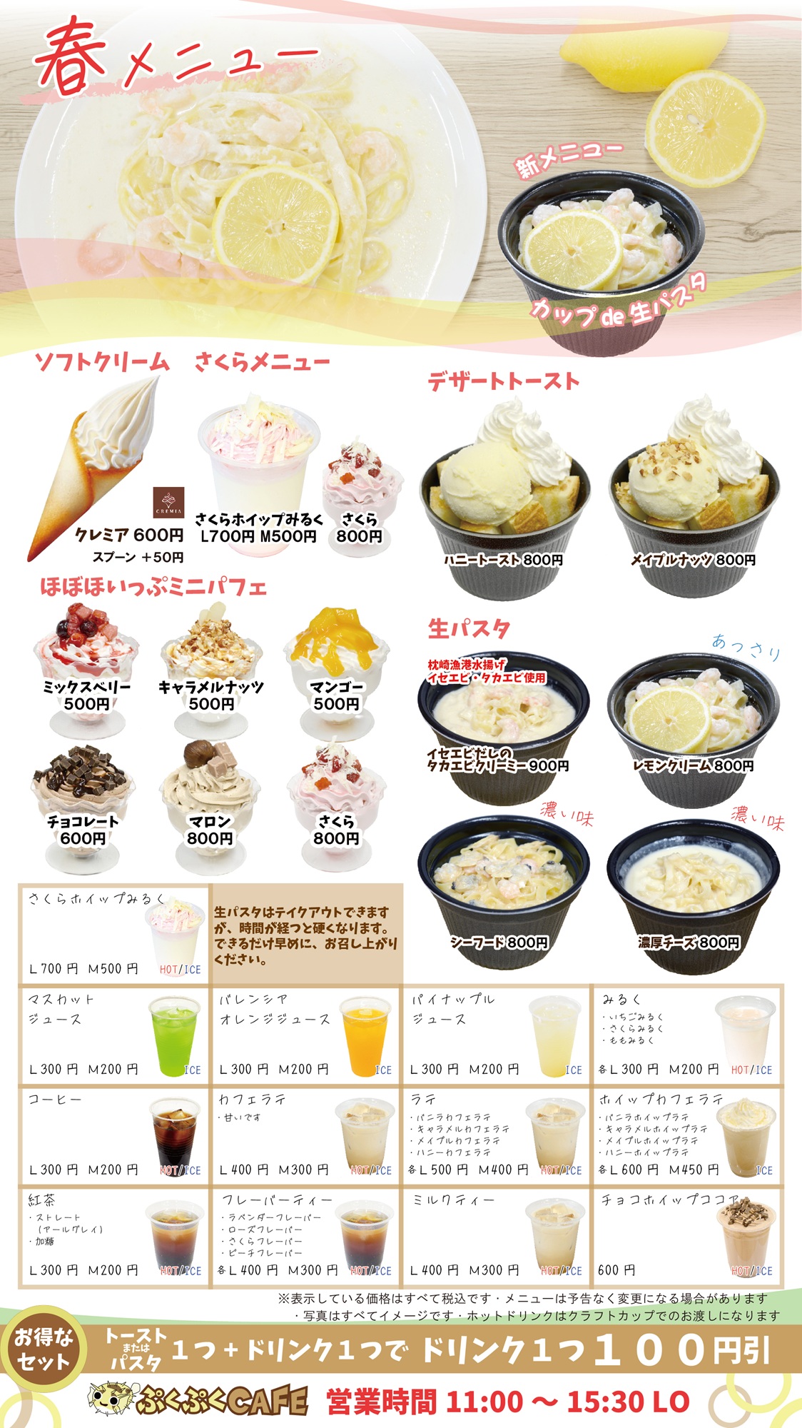 毎月第3水曜日は定休日 最新のメニュー情報は店頭でご確認ください 枕崎みなと食堂 11:00~14:00 L.O. (土日祝日14:30 L.O.) ぷくぷくCAFE 11:00~15:30 L.O. 枕崎みなと食堂 MENU 枕崎鰹船人めし 1,500円 枕崎鰹船人めし かつお2倍 2,000円 枕崎ぶえん鰹丼 1,600円 わら焼きかつおタタキ丼 1,600円 ぶえん鰹&タタキ丼 1,600円 【数量限定】特選地魚海鮮丼 2,000円 【数量限定】地魚漬け丼 1,500円 【数量限定】特選地魚刺身定食 2,400円 【数量限定】地魚刺身定食 1,800円 枕崎ぶえん鰹定食 2,000円 かつおタタキ定食 1,800円 【数量限定】みなとうどん・寿司セット 1,600円 みなとうどん・鰹寿司セット 1,600円 みなとうどん 800円 【数量限定】みなとそば・寿司セット 1,600円 みなとそば・鰹寿司セット 1,600円 みなとそば 800円 お子様うどん 700円 【数量限定】はこだわりの証 地魚メニューは枕崎産にこだわり、枕崎漁港で水揚げされた地魚を直接買い付けしているため、水揚げ状況により数量限定となっております。天候などの影響により提供数の変動があります。 【単品】かんぱちあら煮 700円 【単品】枕崎ぶえん鰹 1,200円 【単品】炭火焼きかつおタタキ 1,000円 【単品】枕崎ぶえん鰹・炭火焼きかつおタタキ 1,100円 【単品】腹皮竜田揚げ 700円 ぷくぷくCAFE MENU 2026.3.1改定